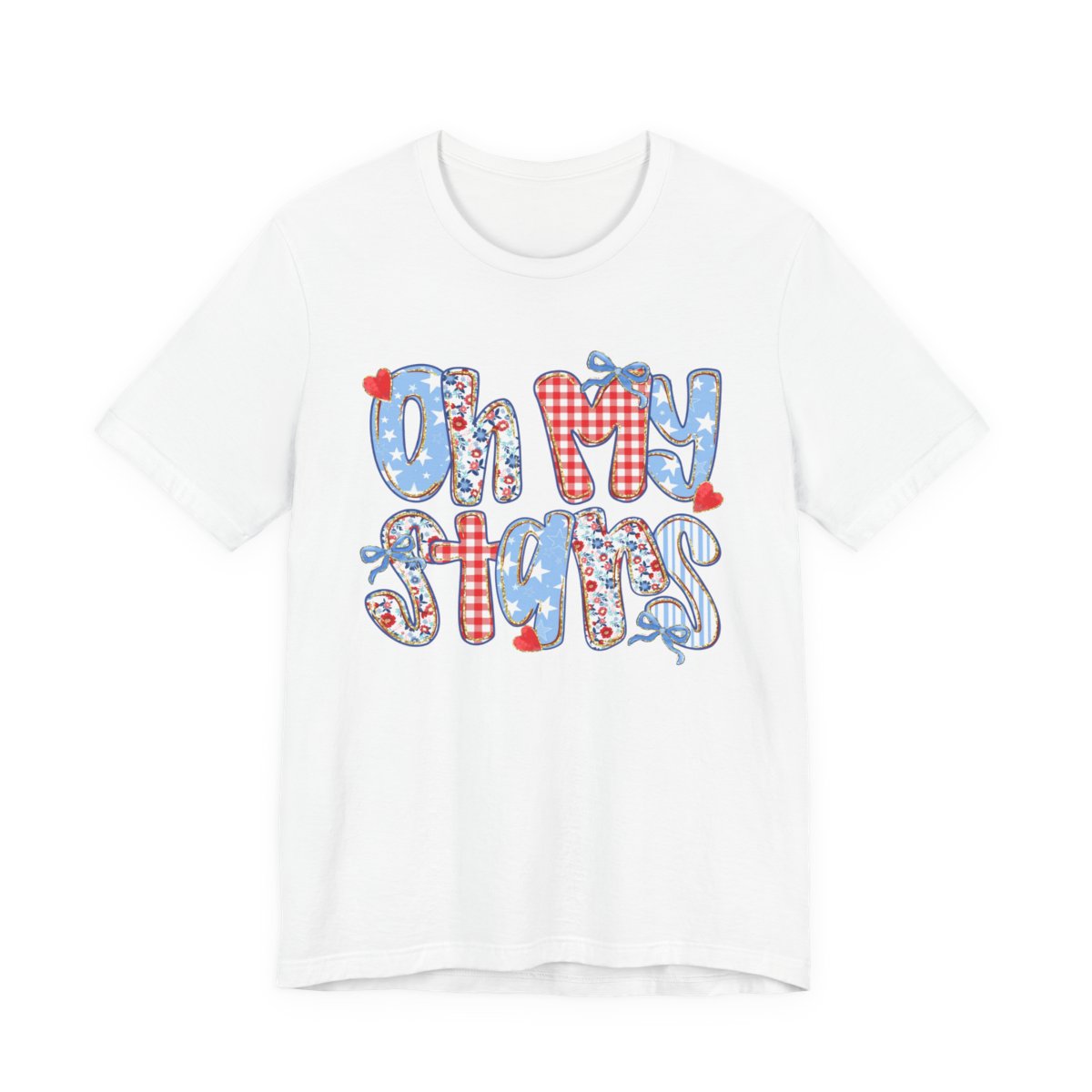 Embrace effortless style with the "Oh My Stars" Adult Tee, perfect for any patriotic occasion: Fourth of July, Memorial Day, Labor Day, Veterans Day, etc.! This unisex jersey short sleeve tee combines comfort and durability, making it a staple in your wardrobe. Enjoy the soft touch of 100% Airlume combed and ring-spun cotton, ensuring a lightweight, breathable wear. Featuring a charming "Oh My Stars" graphic in vibrant, playful colors, this tee adds a fun and stylish touch to your outfit.